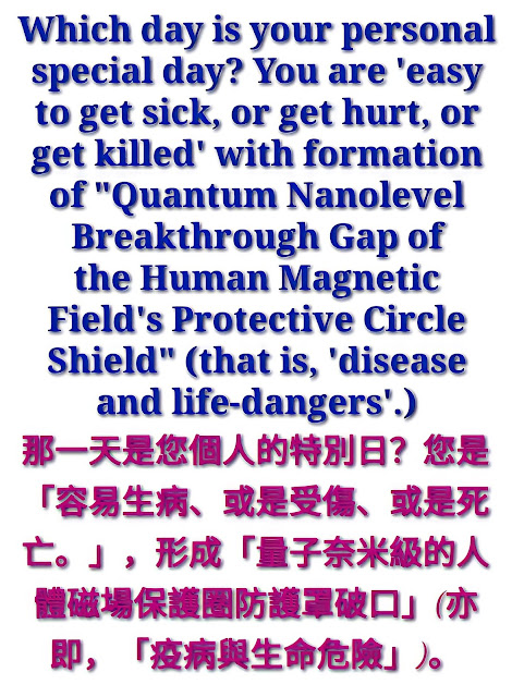 當您能夠預先知道今天是您個人的特別「容易生病日或是受傷日、死亡日。」,亦即形成「量子奈米級的人體磁場保護圈防護罩破口」日期時,您是否能夠更加戒慎恐懼地防範病毒感染呢?我們的「AI 電腦人工智慧」可以讓人類於事先「預先知道疫病與生命危險的特別日期」而加以防範之。
