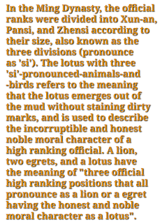 In the Ming Dynasty, the official ranks were divided into Xun-an, Pansi, and Zhensi according to their size, also known as the three divisions (pronounce as 'si'). The lotus with three 'si'-pronounced-animals-and-birds refers to the meaning that the lotus emerges out of the mud without staining dirty marks, and is used to describe the incorruptible and honest noble moral character of a high ranking official. A lion, two egrets, and a lotus have the meaning of "three official high ranking positions that all pronounce as a lion or a egret having the honest and noble moral character as a lotus".