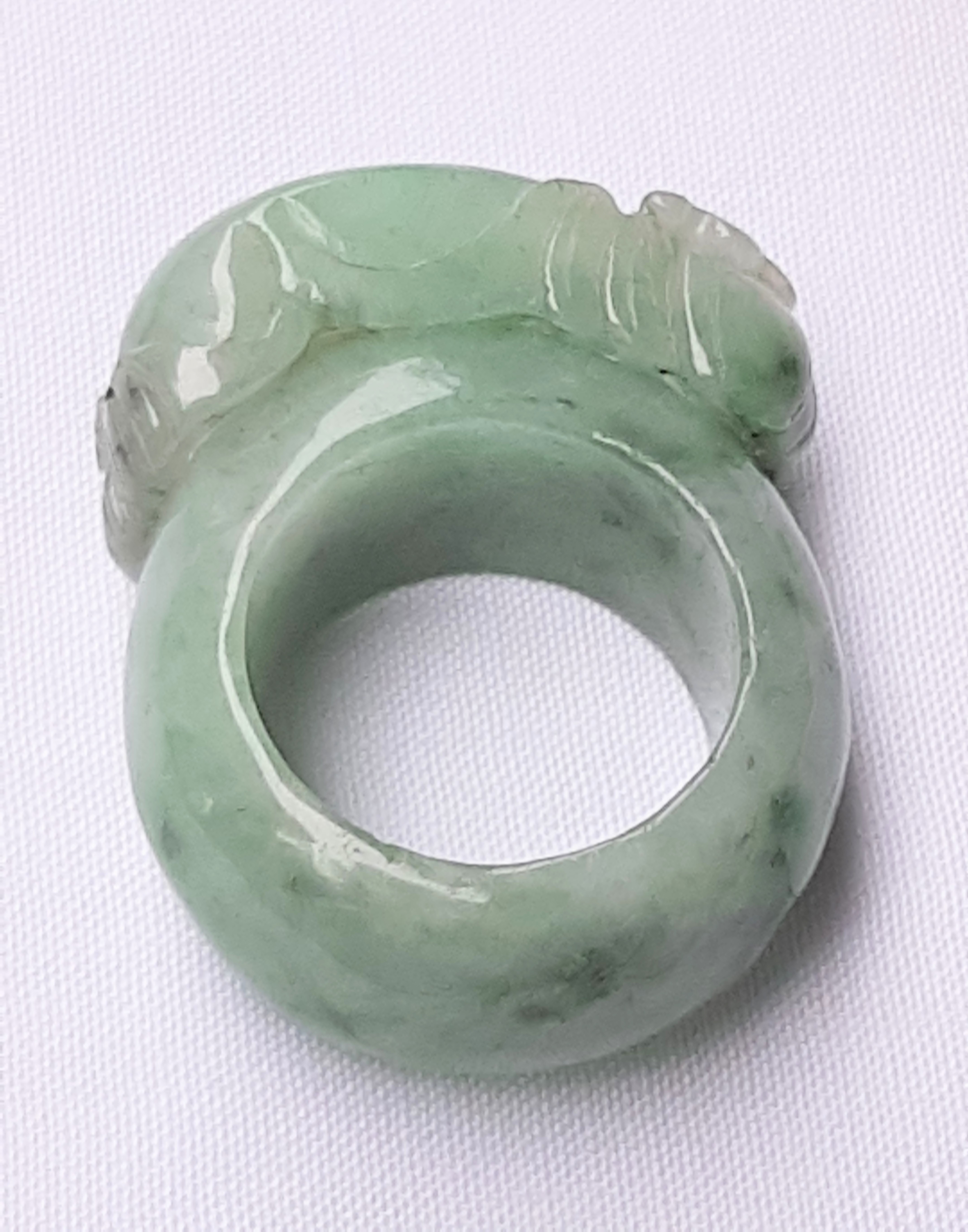 The Qing Dynasty's archery thumb ring was very popular among the ruling class people. It was divided into civil archery thumb ring and military archery thumb ring. Civil archery thumb ring was worn by civil servants and paid attention to precious materials, complex craftsmanship and beautiful appearance. Military archery thumb ring was worn by military officials and was not particular about craftsmanship and appearance. The surface of military archery thumb ring is usually plain and has no patterns. This jadeite carved archery thumb ring is a civil archery thumb ring.