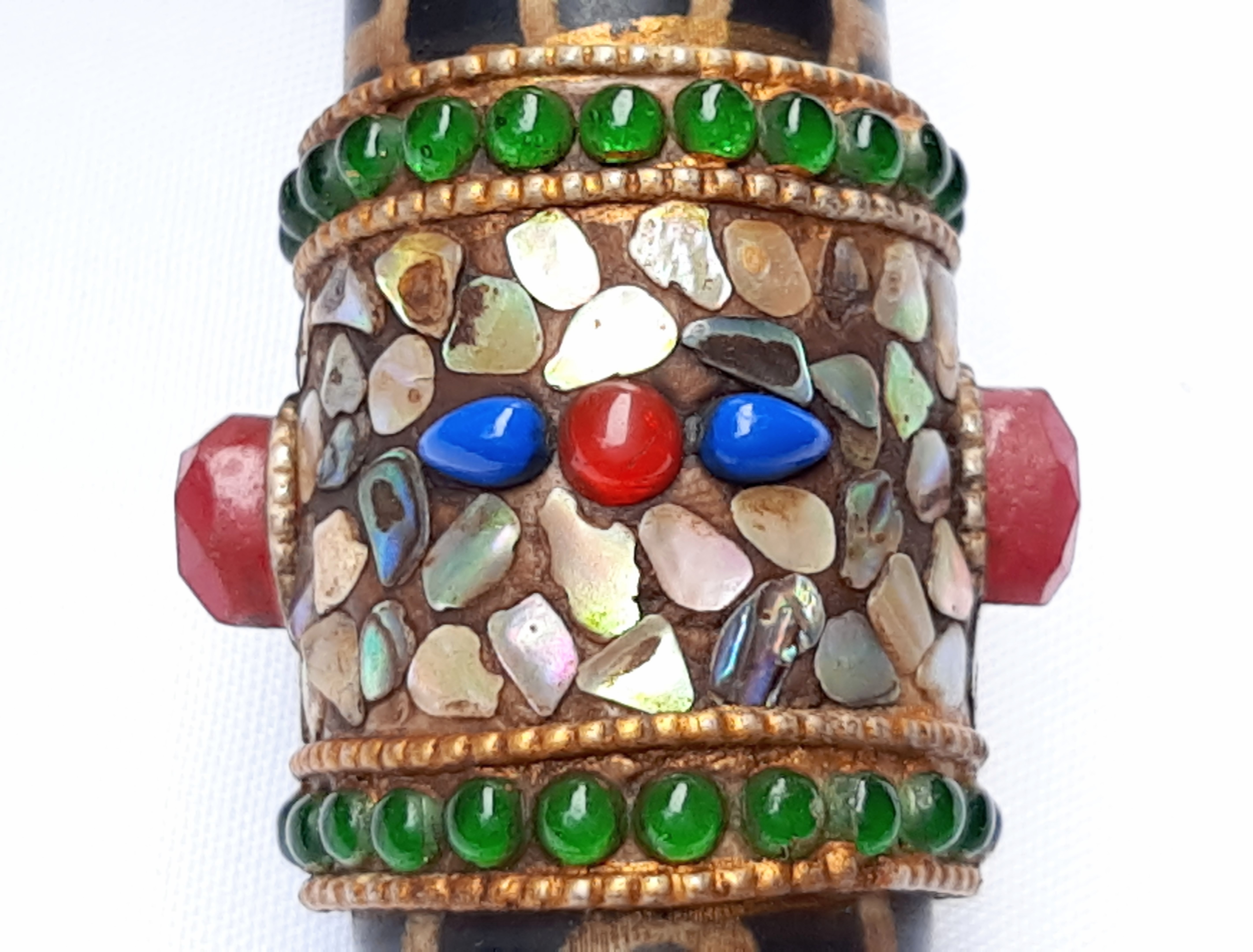 價值三億元人民幣世界上已知最昂貴華麗西藏法王用鑲兩顆6克拉重共12克拉總重鴿血紅紅寶石龜甲長壽紋老天珠 (另鑲嵌八圈金線圈、1+23+23+1 = 48 顆共約6克拉重帝王綠翡翠小圓珠、1+19+2+20+1 = 43 顆共約7克拉重鴿血紅紅寶石小圓珠、1+4+1 = 6 顆共約1.3克拉重2顆藍寶石小圓珠及4顆藍寶石水滴珠、52+81+52 = 185 顆共約7克拉重月光寶石薄片、及配置一顆罕見兩眼老天珠與一顆罕見四眼老天珠)